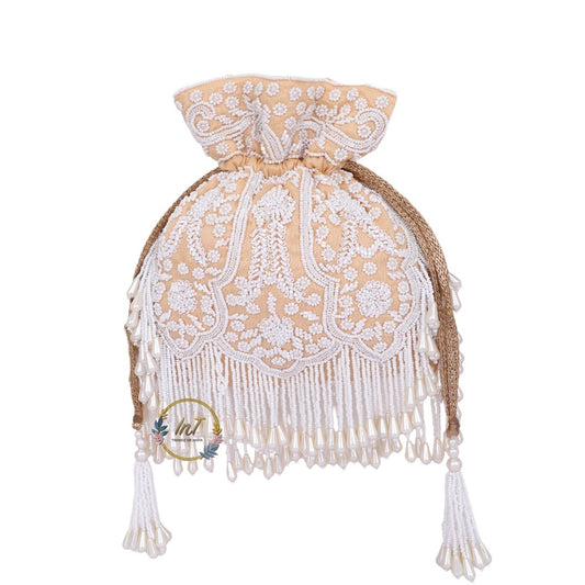 Women White Embroidered Potli Bag with Tassel Jhallar