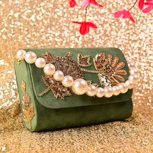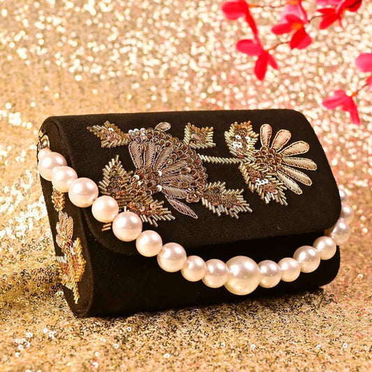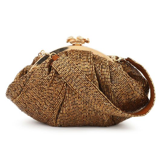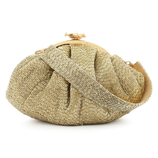 Soft Embroidery Golden Bead Pouch Bag with Handle