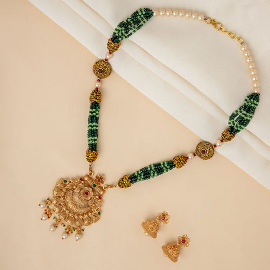 Temple Jewelry Necklace with Flower Pendant and Green Beads for Festivals and Weddings