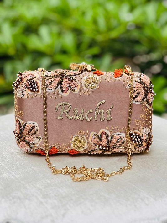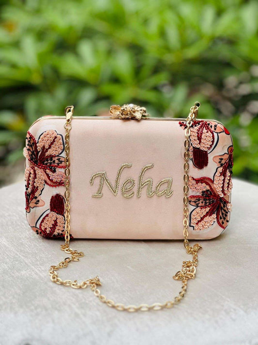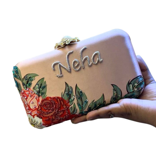 Customized Peach- Pink Embroidery Name Highlight Party Clutch