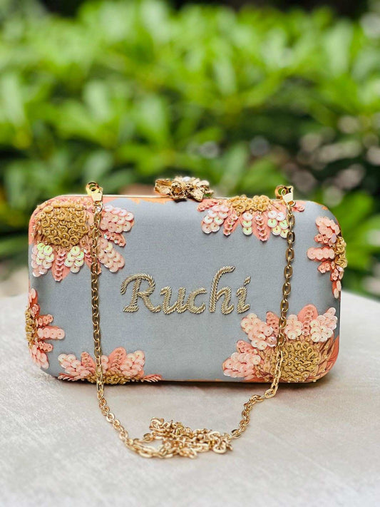 Customized Grey Embroidery Name Highlight Party Clutch