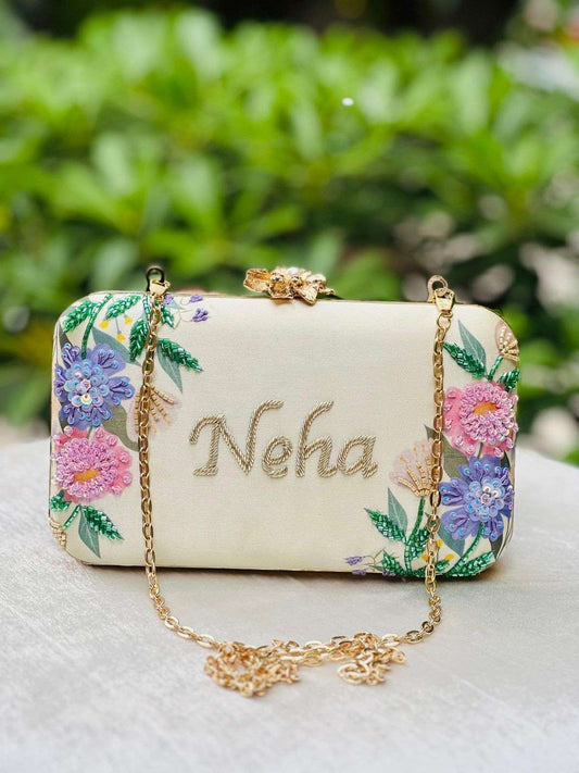 Customised Embroidered Name Clutch Bag – Personalized Floral Purse with Chain